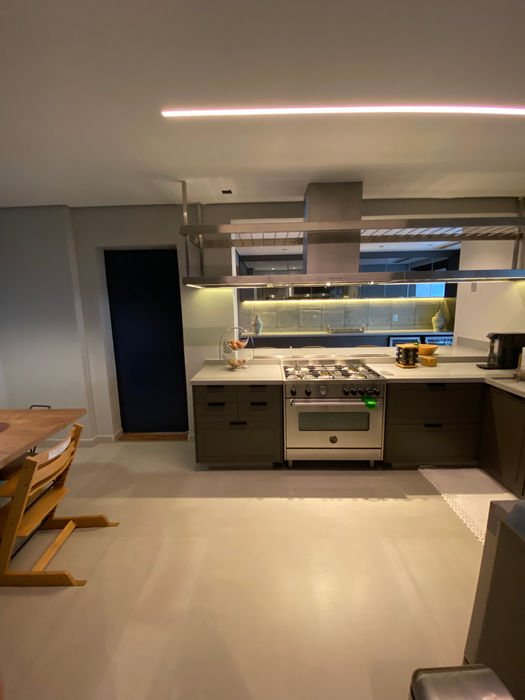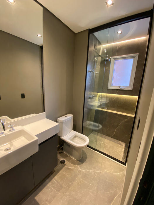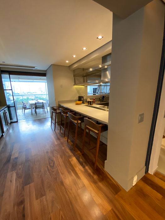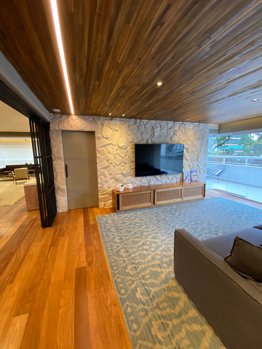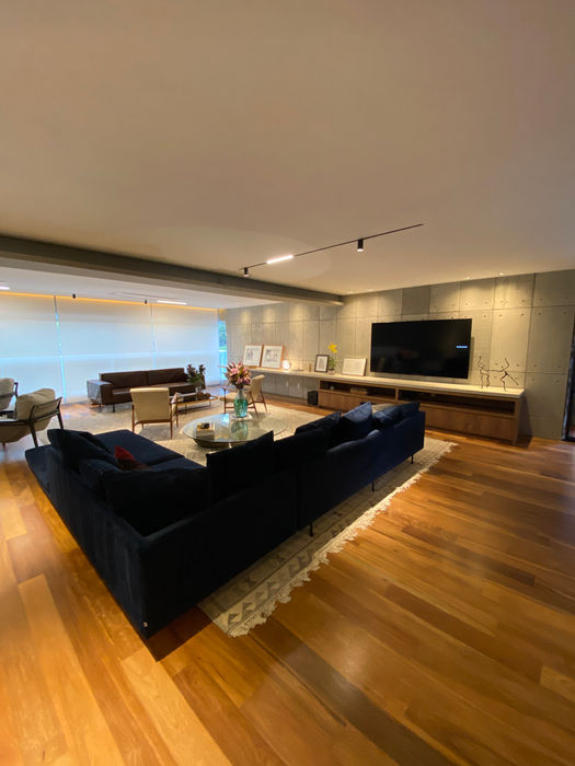 Reforma de um apartamento FANTÁSTICO, Alto Padrão, com aproximadamente 375 m². Os serviços foram diversos: demolição, infra de elétrica/iluminação, serviços de hidráulica, isolamento acústico com lã de Pet, rebaixamento de teto em drywall, pintura interna e externa (varandas), instalação de porcelanatos, instalação de pedras naturais, instalação de placas de concreto (concreto aparente), instalação de piso de madeira (em alguns locais) e etc.